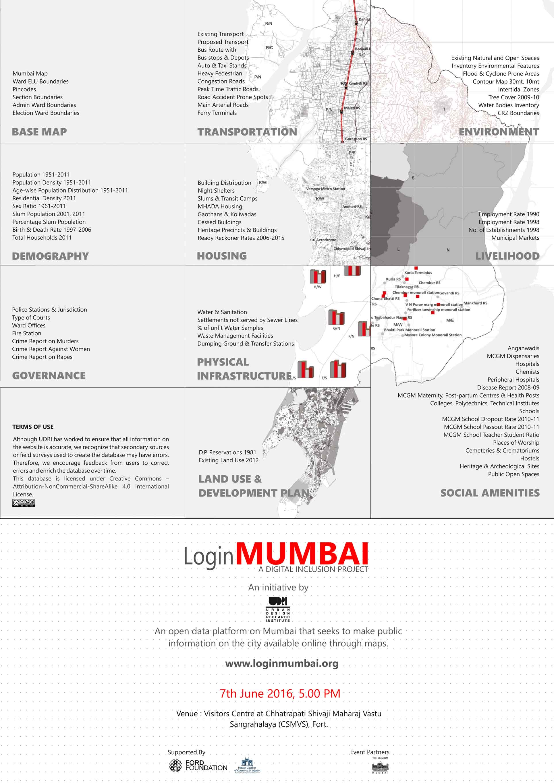 The UDRI’s Mumbai GIS portal, www.loginmumbai.org, was officially launched on June 7th, 2016, at the Chhatrapati Shivaji Maharaj Vastu Sangrahalaya (CSMVS) Visitor Centre, Fort. It was followed by a panel discussion with economist & political analyst Ajit Ranade, columnist & media consultant Alok Thakore and Ravina Aggarwal, director of Columbia Global Centers, South Asia. The session was moderated by UDRI trustee and executive committee member Cyrus Guzder.