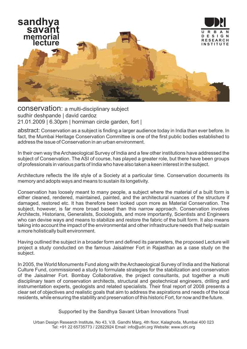 Sandhya Savant was a Conservation Architect and alumni of Sir JJ College of Architecture, who made a tremendous contribution in the realm of conservation practice in the city of Mumbai before passing away suddenly in 2006. Since then, supported by her family, UDRI conducts an annual memorial lecture to deliberate on urban issues.