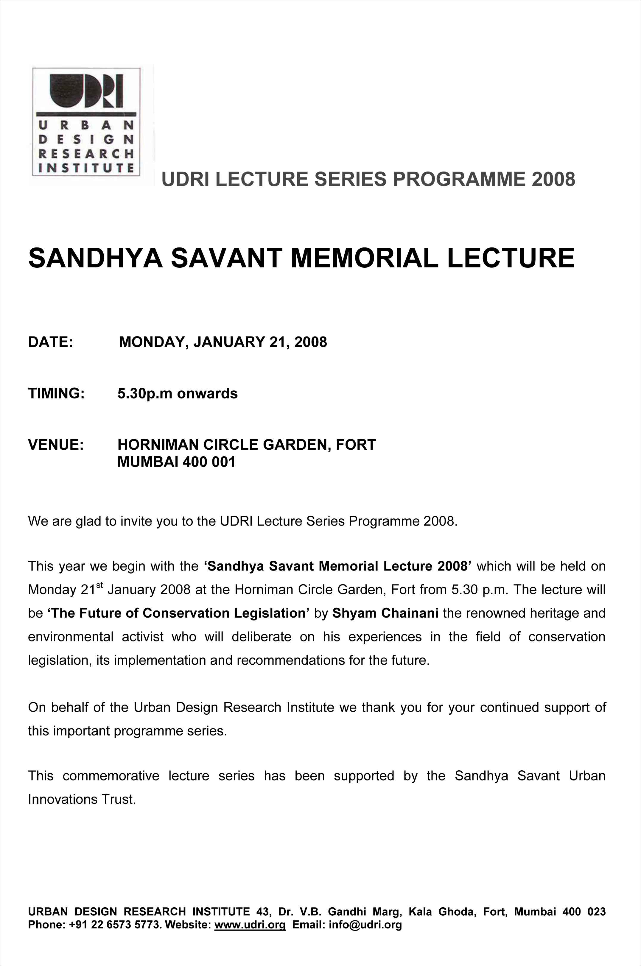 Sandhya Savant was a Conservation Architect and alumni of Sir JJ College of Architecture, who made a tremendous contribution in the realm of conservation practice in the city of Mumbai before passing away suddenly in 2006. Since then, supported by her family, UDRI conducts an annual memorial lecture to deliberate on urban issues.