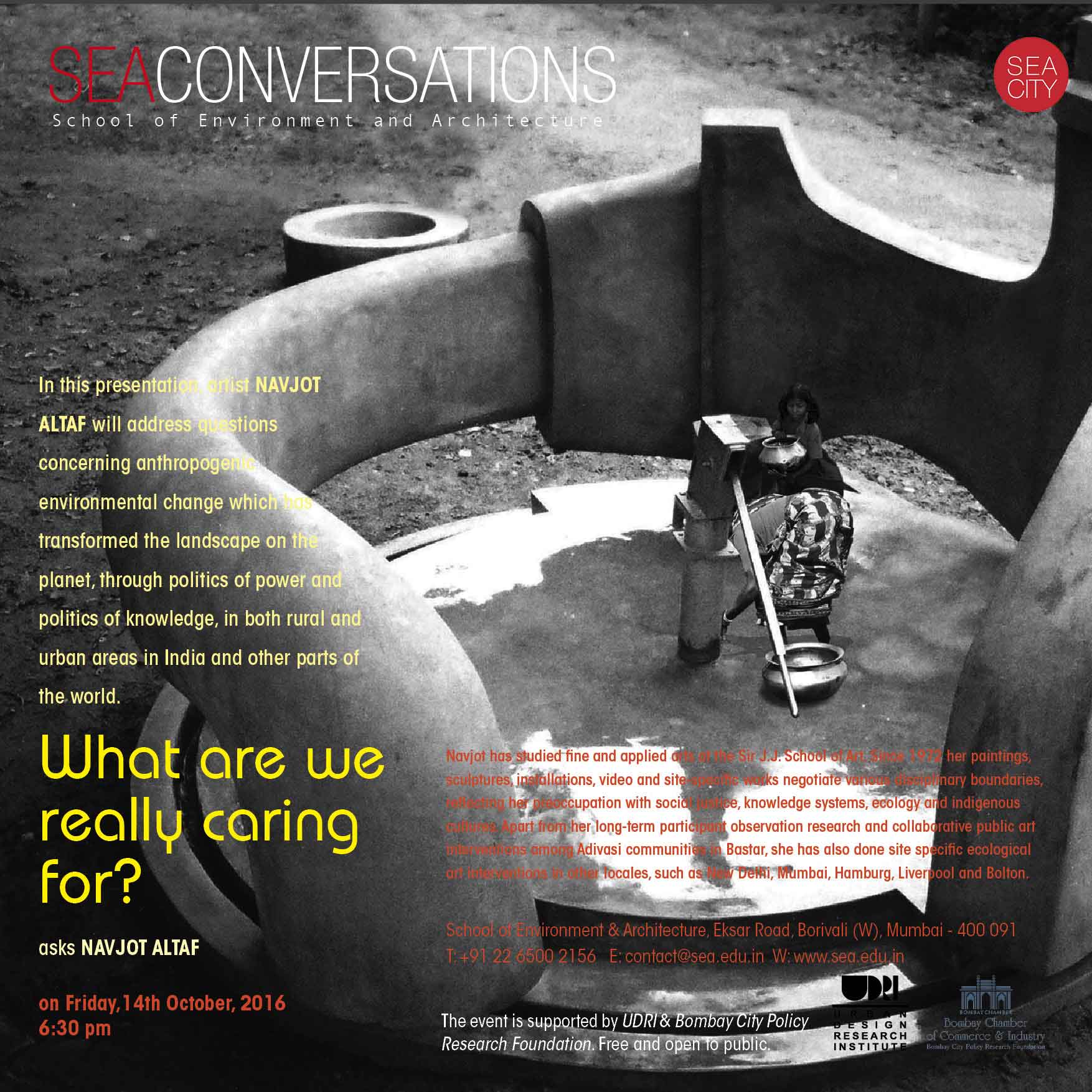 This presentation addressed questions concerning anthropogenic environmental changes that have transformed the landscape on the planet, through politics of power and politics of knowledge, in both rural and urban areas in India and other parts of the world. How all kinds of intrusion is sanctioned without much consideration for its impact on ecology, living beings, future generations, the web of life of which both people, non-people are a part. How with the models adopted for the fast development and economic growth and in the endless pursuit of profit for the few, natural resources are viewed as objects of property to be bought and sold with the proprietor possessing rights to nourish or abuse. “How to care for a possible world, does caring mean arresting wide spread denial of the violence being done to all forms of life? Can artists or creative people offer different kinds of witnessing of such sights, seen and unseen? Can creative and inclusive ways draw people into an opening- rather than recruiting them into a fixed vision of how things might be”
