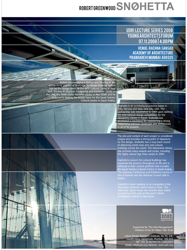 YOUNG ARCHITECTS FORUM View Larger Image Event Date: 7th November 2008 Speaker: Robert Greenwood, SNOHETTA Venue: Rachna Sansad, Academy of Architecture, Mumbai UDRI ADMIN2016-12-05T08:54:22+00:00 Share This Story, Choose Your Platform! FacebookTwitterLinkedInEmail