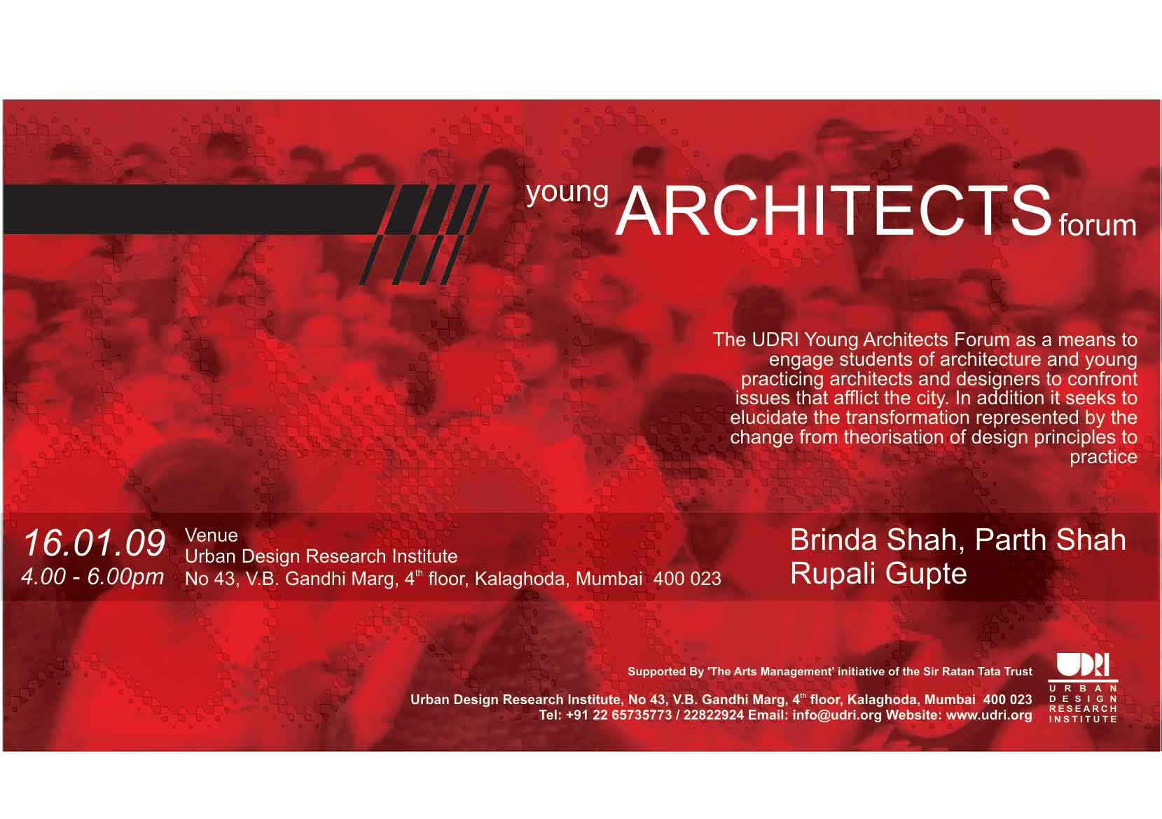 YOUNG ARCHITECTS FORUM View Larger Image Event Date: 16th January 2009 Speakers: Brinda and Parth Shah, Rupali Gupte Venue: Urban Design Research Institute UDRI ADMIN2017-01-21T15:05:35+00:00 Share This Story, Choose Your Platform! FacebookTwitterLinkedInEmail